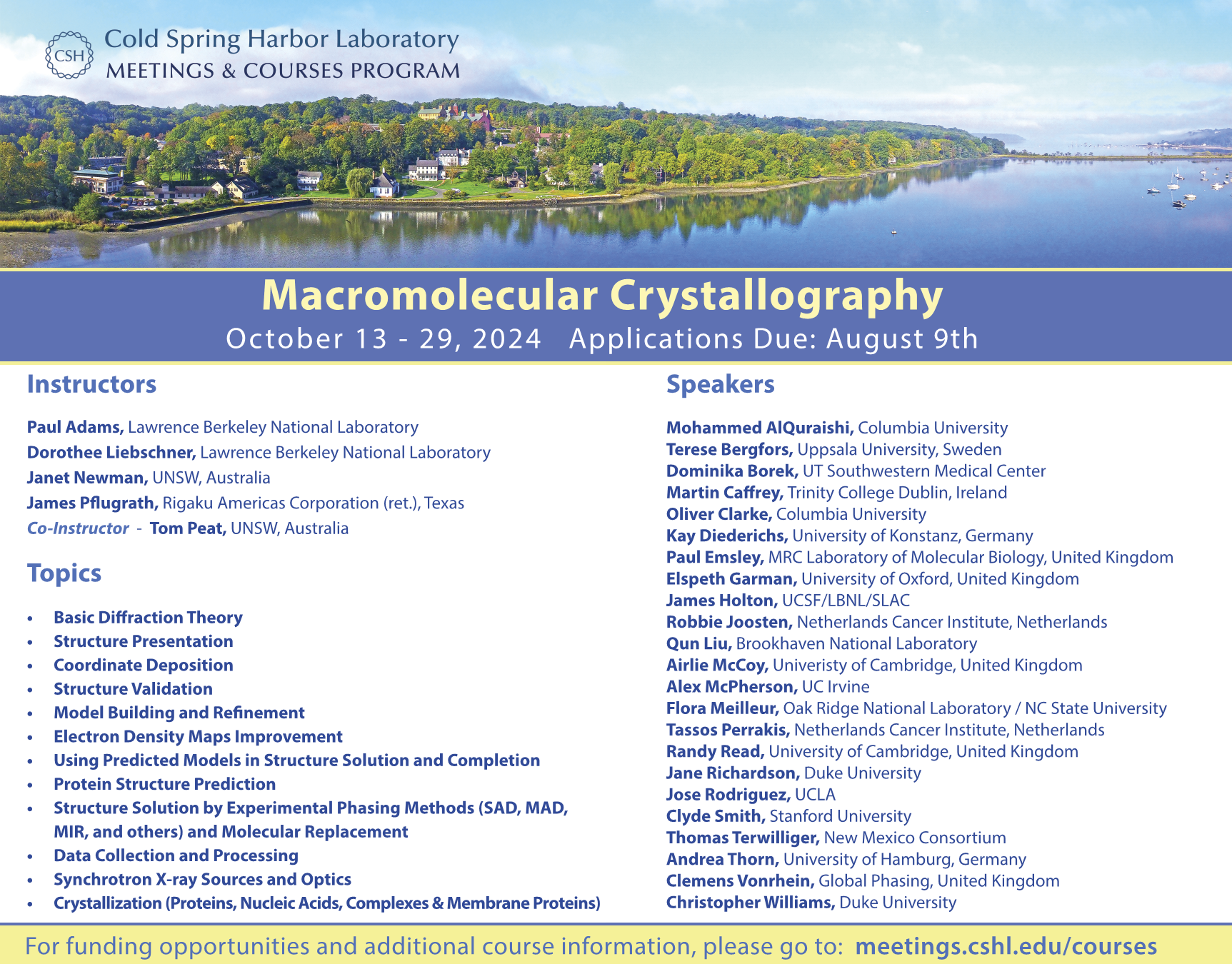 Dear Colleagues, We have extended the deadline for the course applications to August 9th. A reminder that the Cold Spring Harbor Macromolecular Crystallography course will take place October 13-29th this year (pleased see below for more details). This comprehensive course is an outstanding place to learn both the theoretical and practical aspects of macromolecular crystallography. There are extensive lectures and practical sessions from world recognized experts in crystallization, data collection, data processing, structure solution, refinement, and validation. The goal of the course is for researchers who have had some exposure to structural biology to become experts in crystallography. This is an experience in macromolecular crystallography learning that cannot be found anywhere else, and the student/teacher ratio is often 1:1. Please follow the link below to the course web site. In particular, please note the information about the various fellowships, scholarships, and stipends that are available. If anyone has any questions please send me an e-mail, and we will be happy to answer all queries. Paul Adams  Cold Spring Harbor Laboratory - Meetings & Courses | 1 Bungtown Road, Cold Spring Harbor, NY 11724 -- Paul Adams (he/him/his) Associate Laboratory Director for Biosciences, LBL (https://biosciences.lbl.gov) Principal Investigator, Computational Crystallography Initiative, LBL (http://cci.lbl.gov) Vice President for Technology, the Joint BioEnergy Institute (http://www.jbei.org) Principal Investigator, ALS-ENABLE, Advanced Light Source (http://als-enable.lbl.gov) Laboratory Research Manager, ENIGMA Science Focus Area (http://enigma.lbl.gov) Adjunct Professor, Department of Bioengineering, UC Berkeley (http://bioeng.berkeley.edu) Member of the Graduate Group in Comparative Biochemistry, UC Berkeley (http://compbiochem.berkeley.edu) Building 91, Room 410 Building 978, Room 4126 Tel: 1-510-486-4225 http://cci.lbl.gov/paul ORCID: 0000-0001-9333-8219 Lawrence Berkeley Laboratory 1 Cyclotron Road BLDG 91R0183 Berkeley, CA 94720, USA. Executive Assistant: Michael Espinosa [ [email protected] ][ 1-510-333-6788 ] Phenix Consortium: Ashley Dawn [ [email protected] ][ 1-510-486-5455 ] --