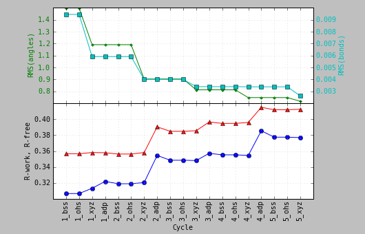 Hi Morten, while I'm waiting for the files, and then while working on fixing the problem (if you send me the files), could you please try one more thing? Try switching from the default: bulk_solvent_and_scale.mode=fast to bulk_solvent_and_scale.mode=slow In the GUI you will need to go to "All parameters" to do so. Thanks, Pavel